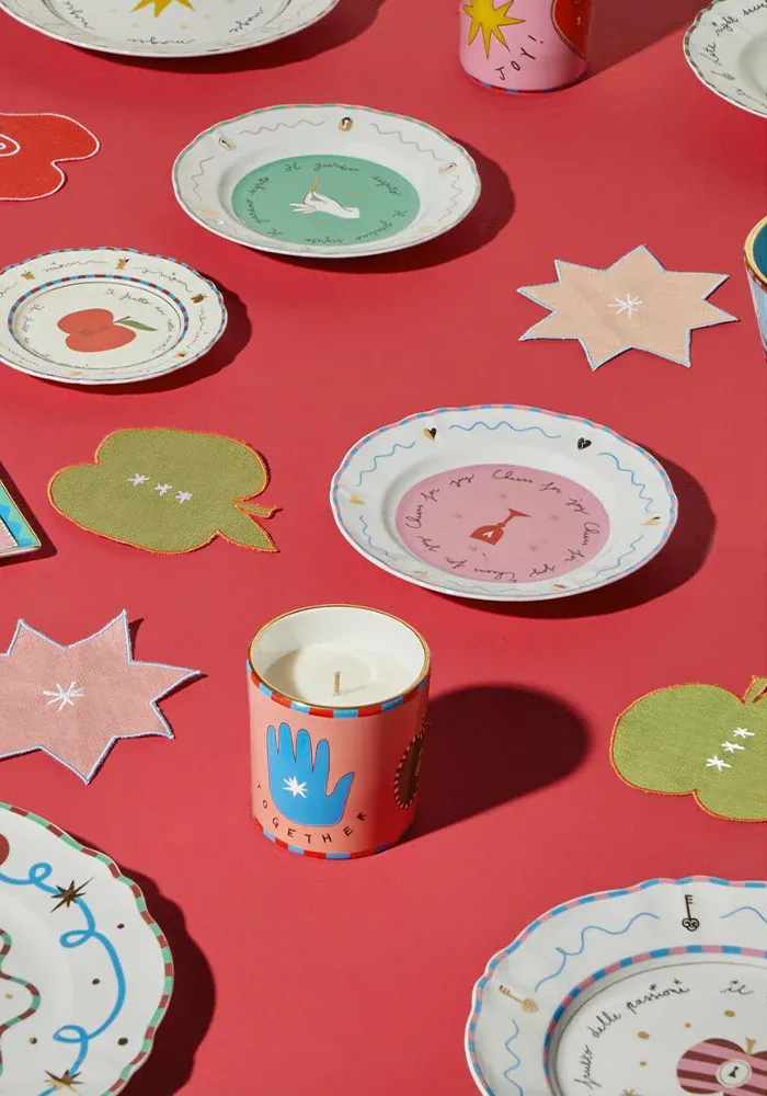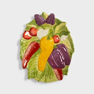 Assiette plate fruits en porcelaine avec des motifs coeurs et des inscriptions tout autour de l’assiette.