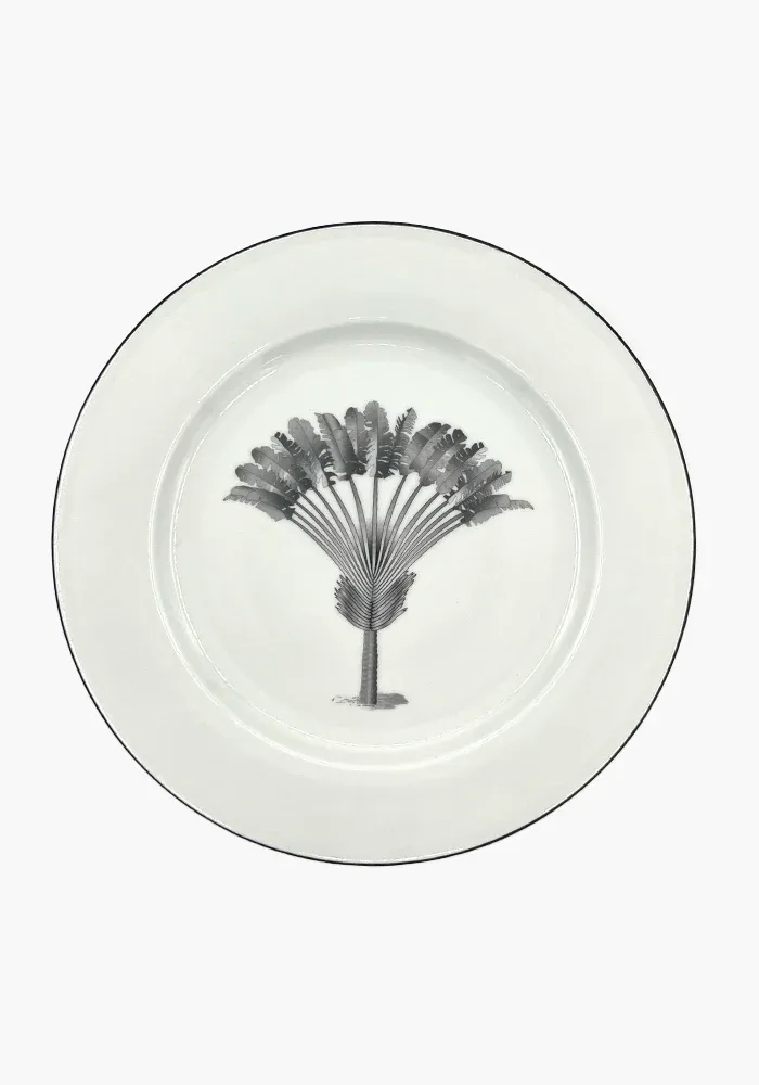 Assiette en porcelaine avec un motif dattier en noir.