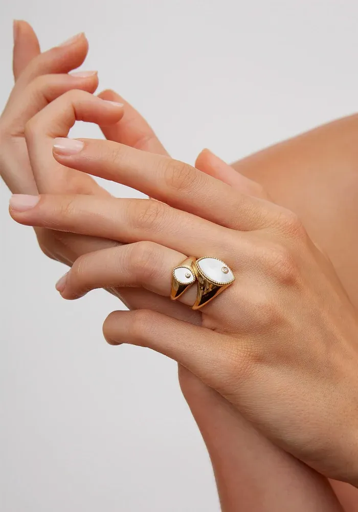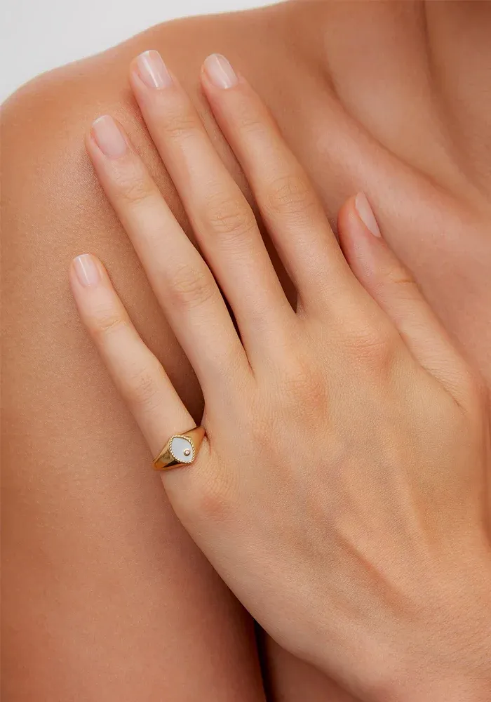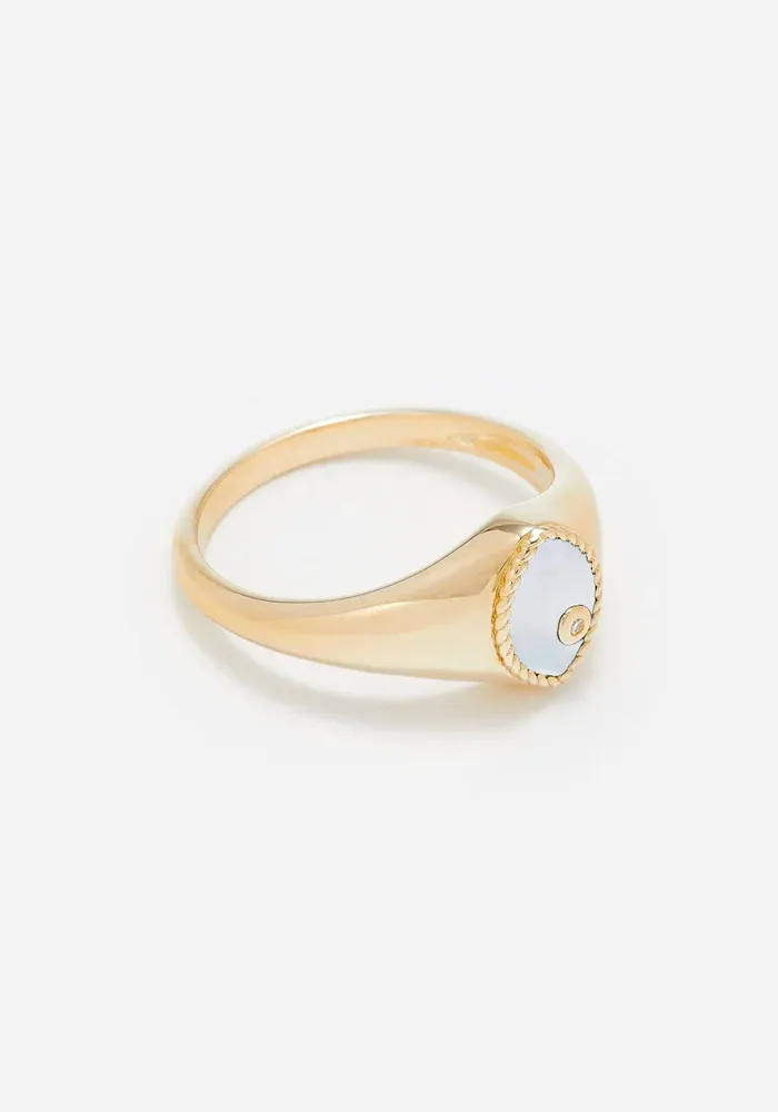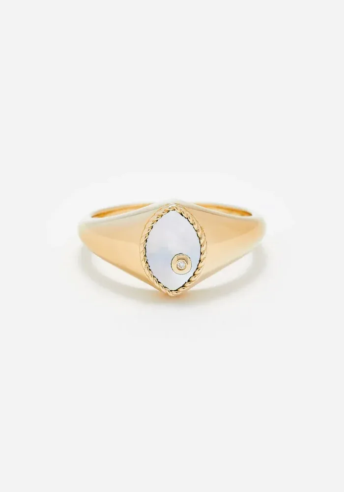 Bague Baby chevalière Marquise en or jaune 9 carats avec une nacre coupe marquise et un diamant blanc.