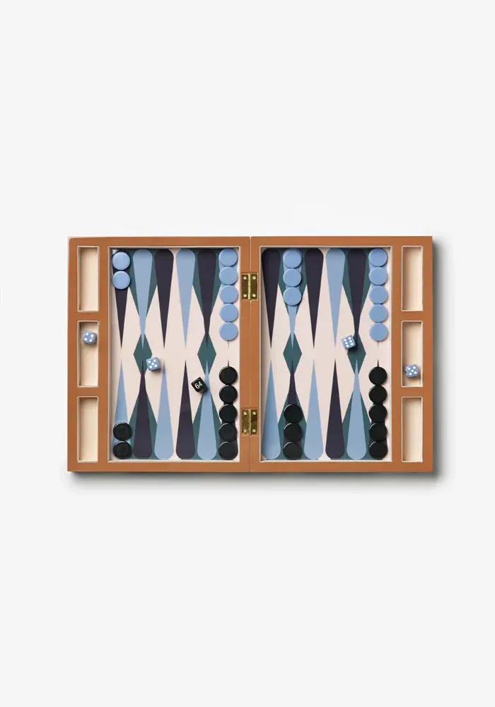 Jeu de Backgammon Lacquered Wood laqué de couleur beige, camel ,bleu et vert.
