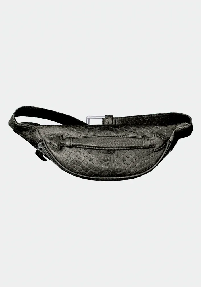 Sac banane Mike en python noir avec deux fermeture éclair décorative à l’avant.