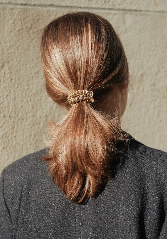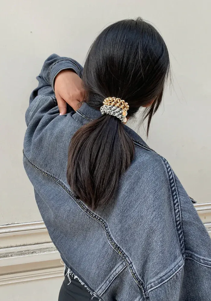 Bichou bracelet-chouchou avec des anneaux entremêlés dorés autour d’un élastique.