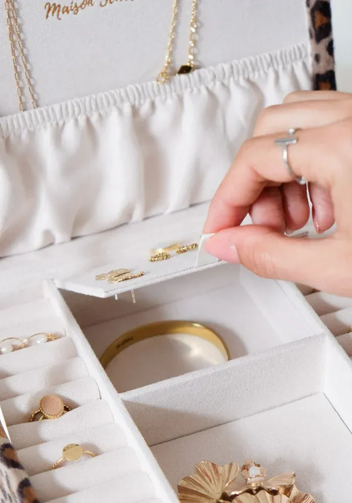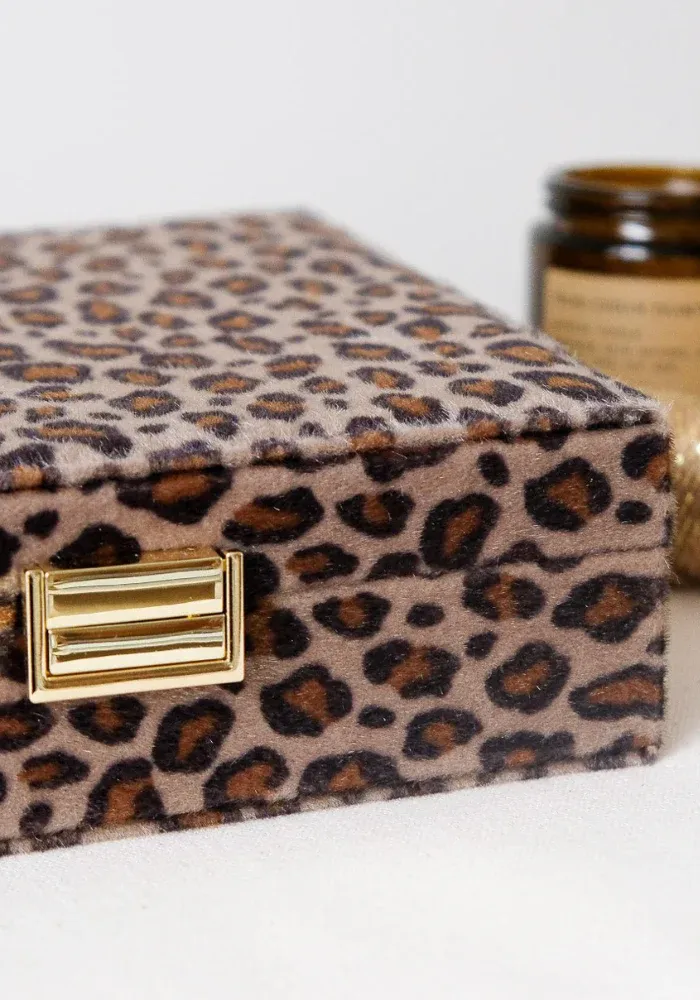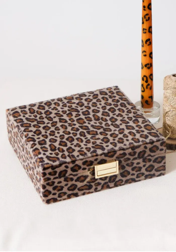 Boite à bijoux Anne en format carré compact imprimé léopard avec des compartiments pour le rangement de colliers, bagues et boucles d’oreilles.