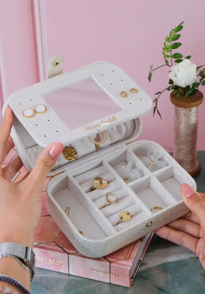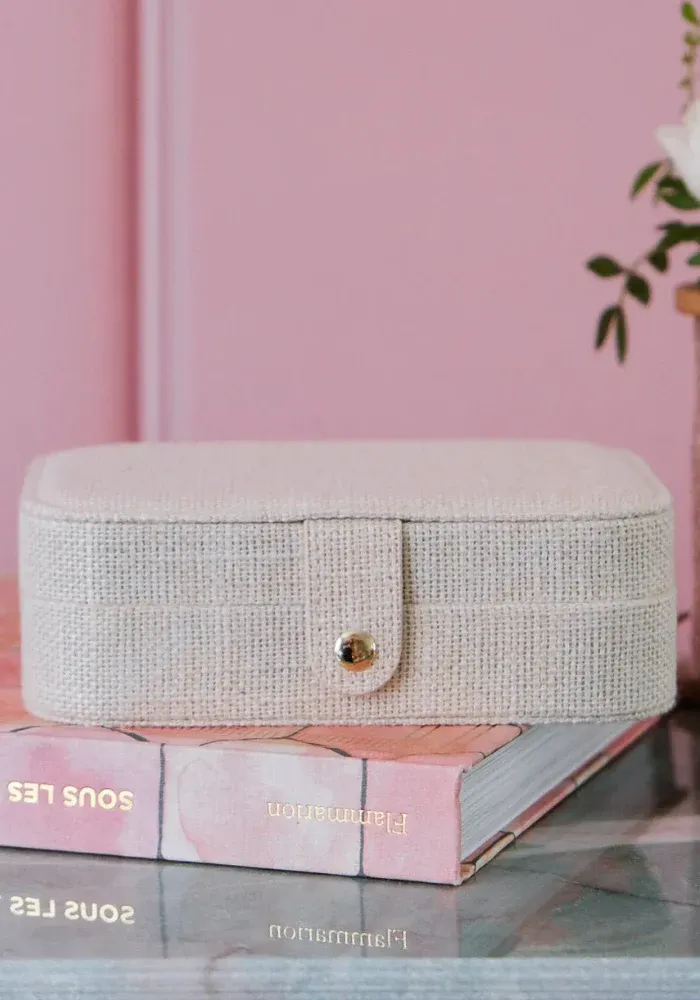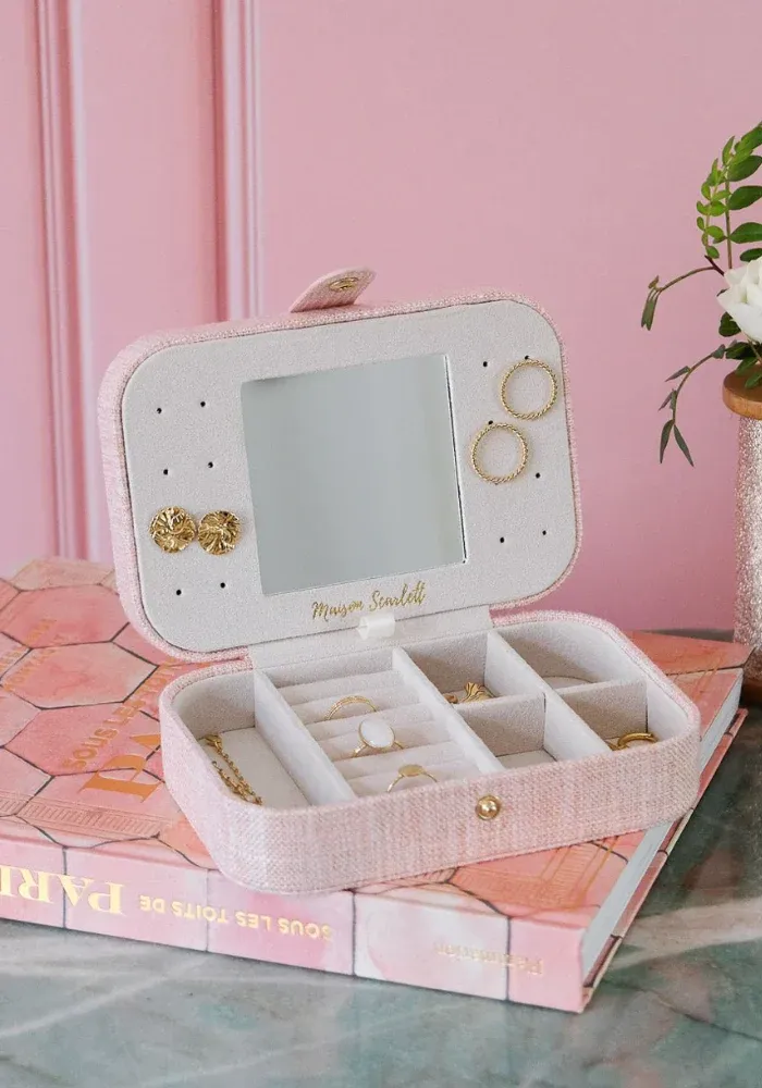 Boîte à bijoux Brigitte en lin rose modulable format rectangle compact.
