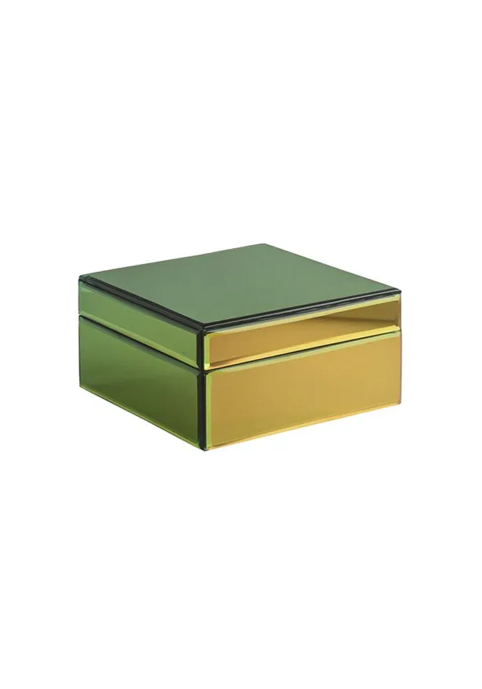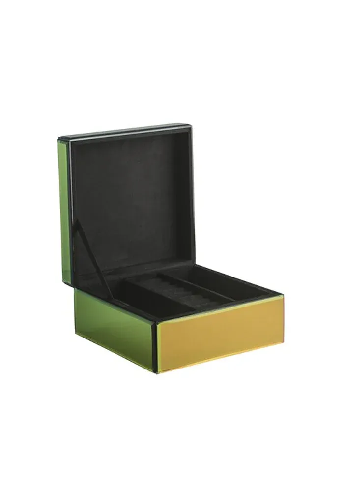 Boîte à bijoux miroir avec des couleurs iridescentes et un étage de rangement.