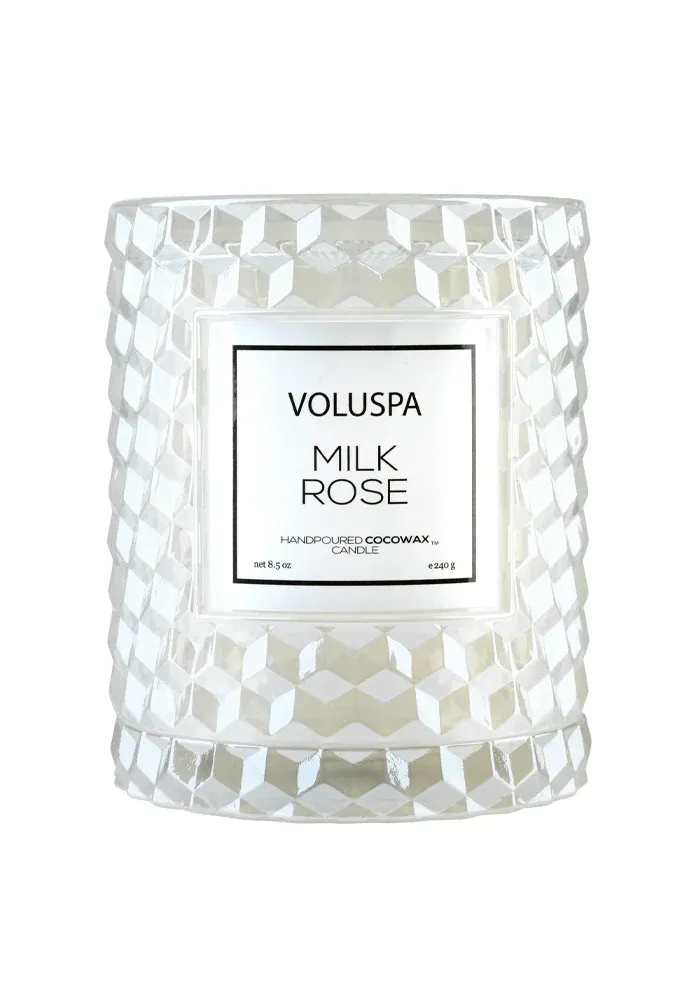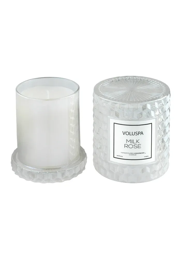 Bougie avec couvert à cloche de la gamme Roses avec un verre texturé.