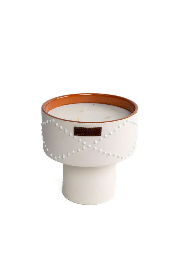 Bougie Coupe Nomad M en céramique blanche avec des pois blancs en relief et 3 mèches.
