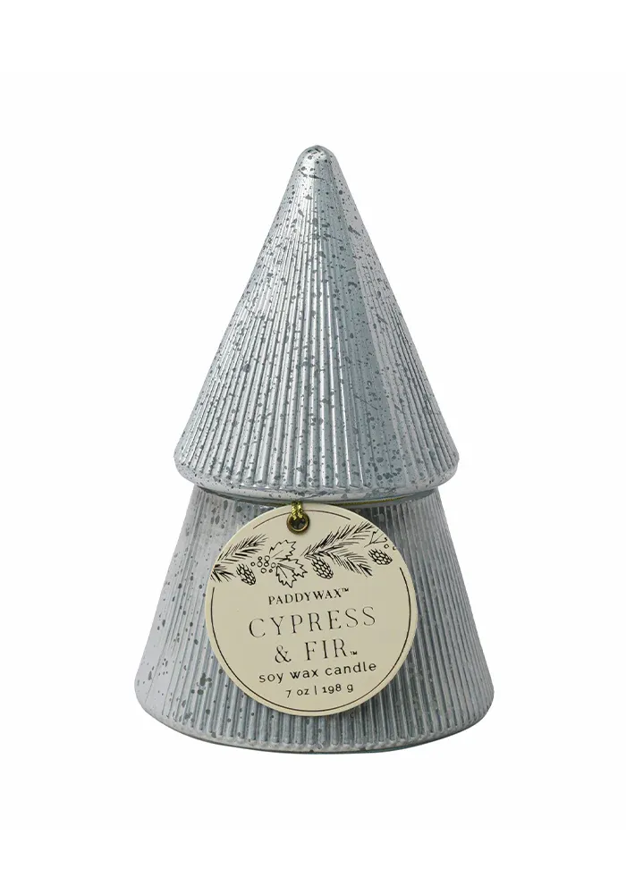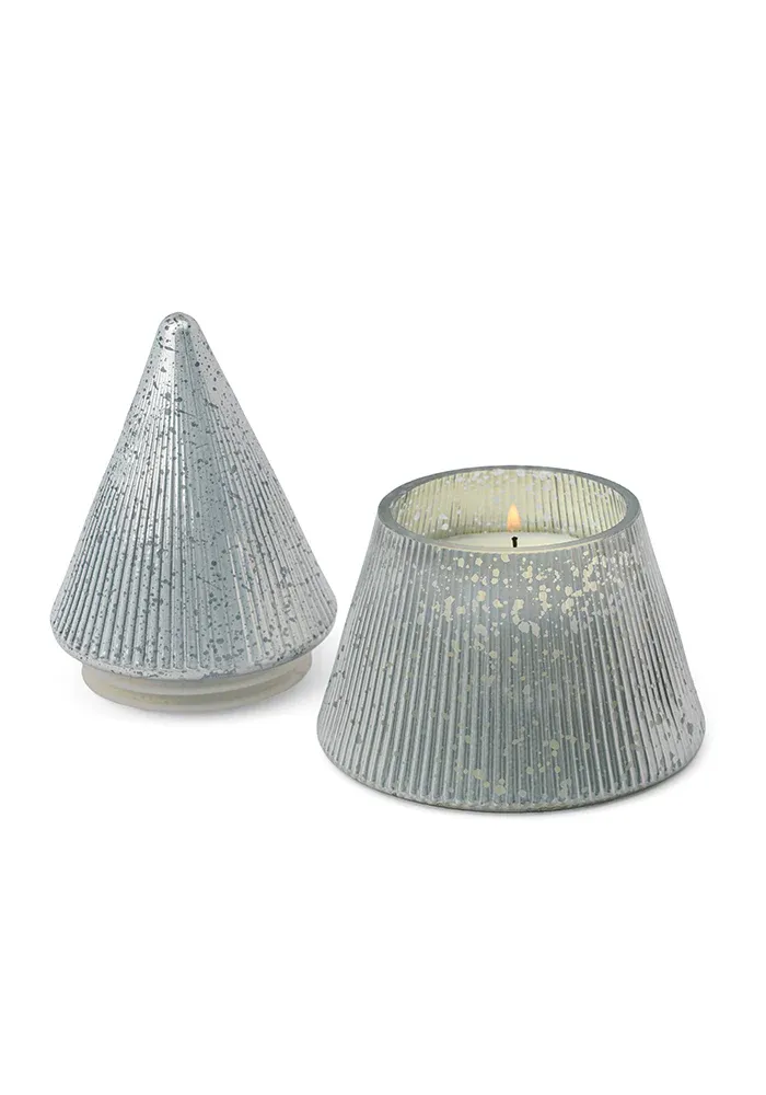 Bougie Cypress and fir en forme de sapin en verre mercurisé couleur argenté.