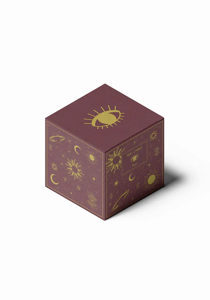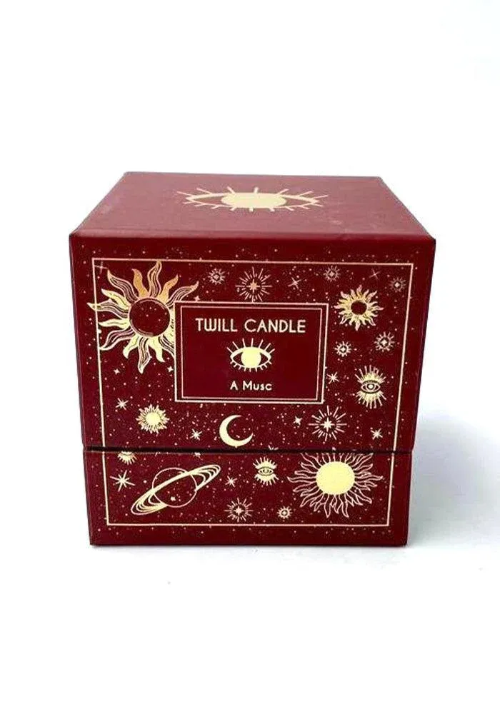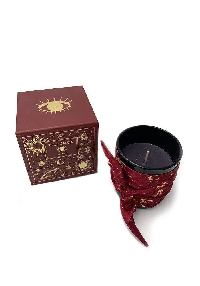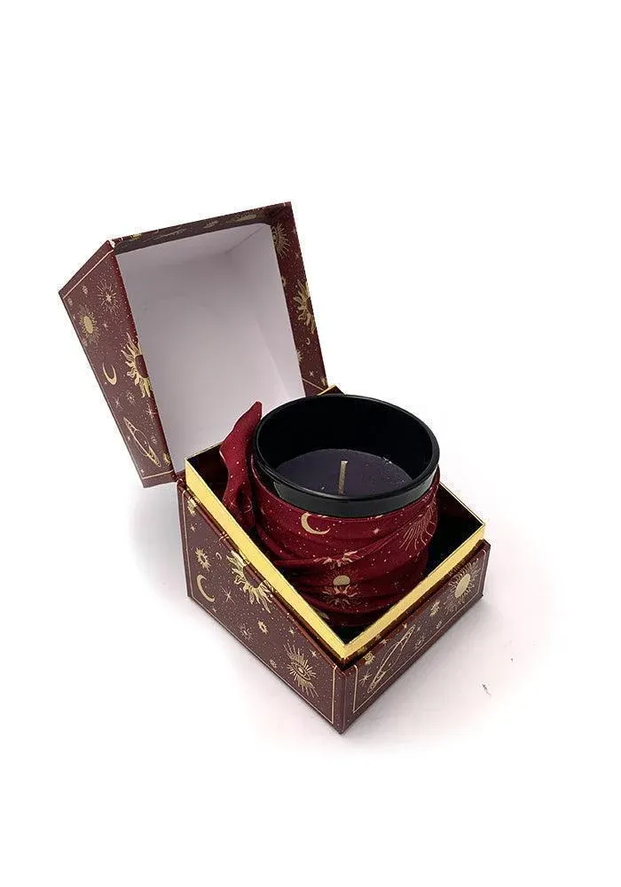 Bougie Cosmic Blush de couleur bordeaux avec oeil doré présenté dans son écrin avec son foulard cosmic bordeaux. Bougie en cire végétale, senteur musc.