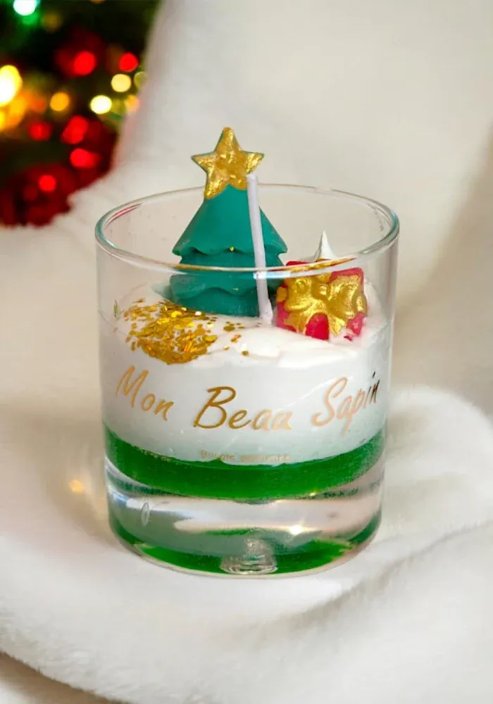 Bougie Mon Beau Sapin grand modèle avec de la cire verte et blanche, un sapin et un cadeau.
