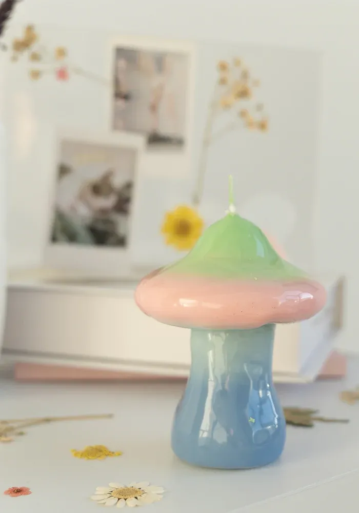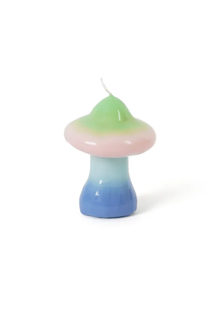 Bougie Mushroom petit modèle dégradé vert, rose et bleu.