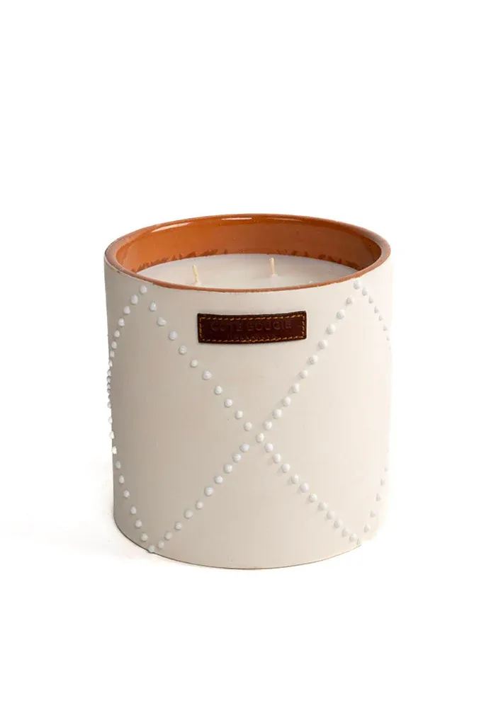 Bougie de la collection Nomad Blanc, décorée de pois terracotta.