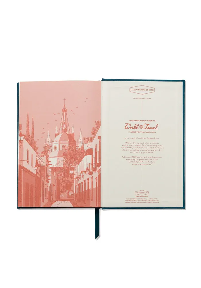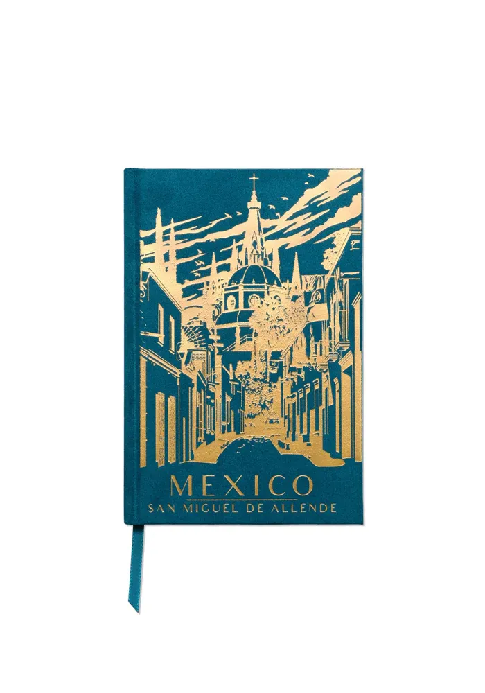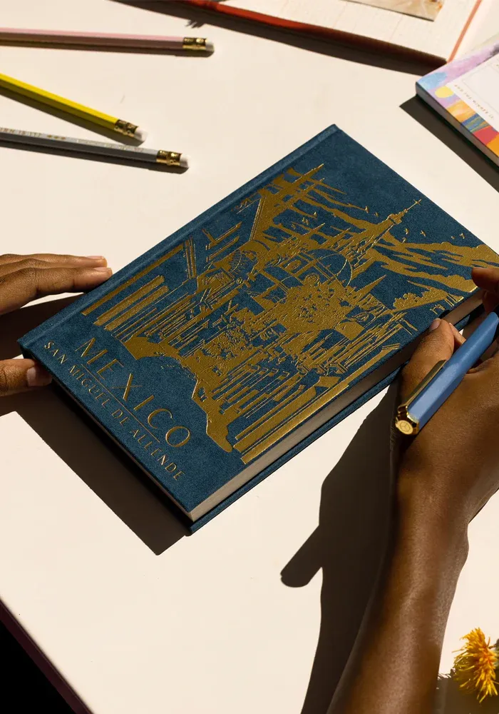Calendrier Perpetuel Mexico avec une couverture rigide bleue en papier suédé doux au toucher avec des dessins dorés.