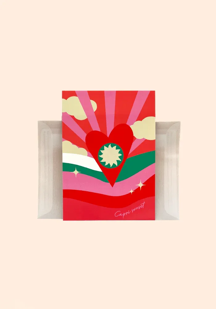 Carte de voeux Capri Sunset format A6 avec une illustration couché de soleil avec un coeur.