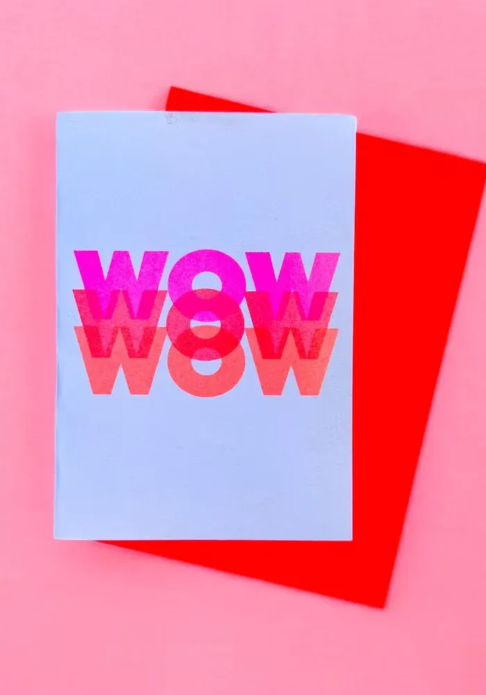 Carte avec le message « Wow » écrit plusieurs fois et son enveloppe rouge.