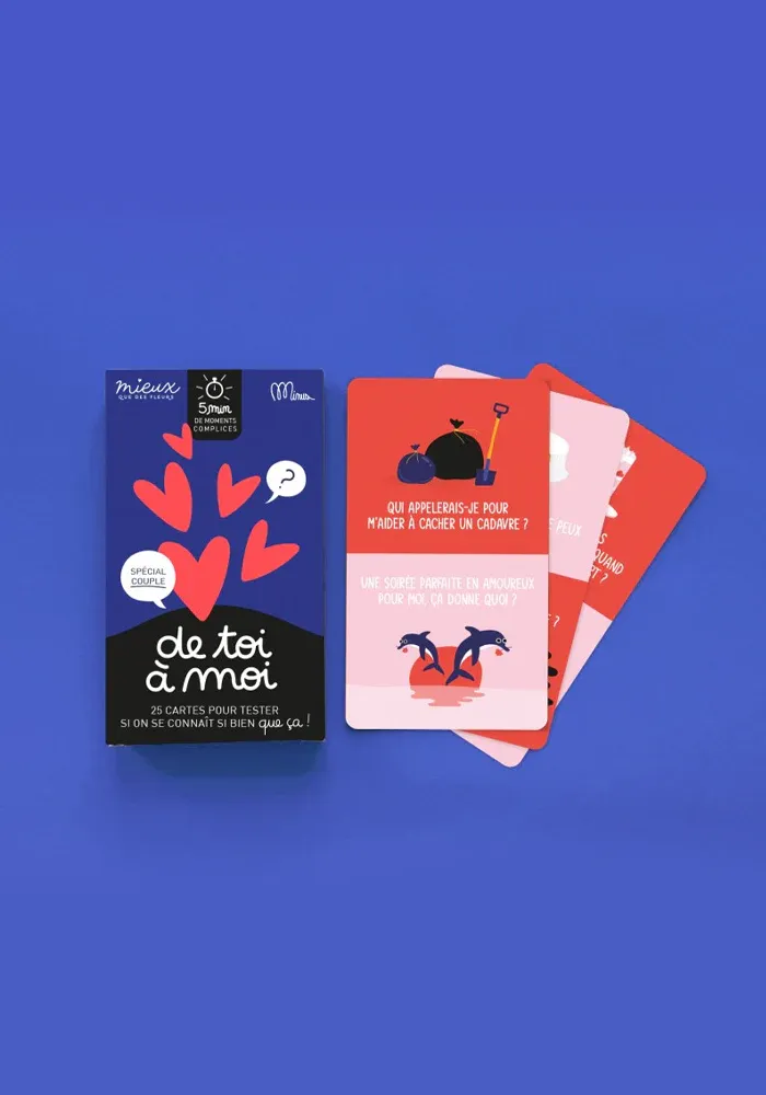 50 questions vous attendent et en vous glissant dans la peau de l’autre, vous allez découvrir si vous vous connaissez bien ! Des débats sans fin, des fous-rires assurés et surtout un chouette moment d’échange et d’amour, rien qu’à deux !