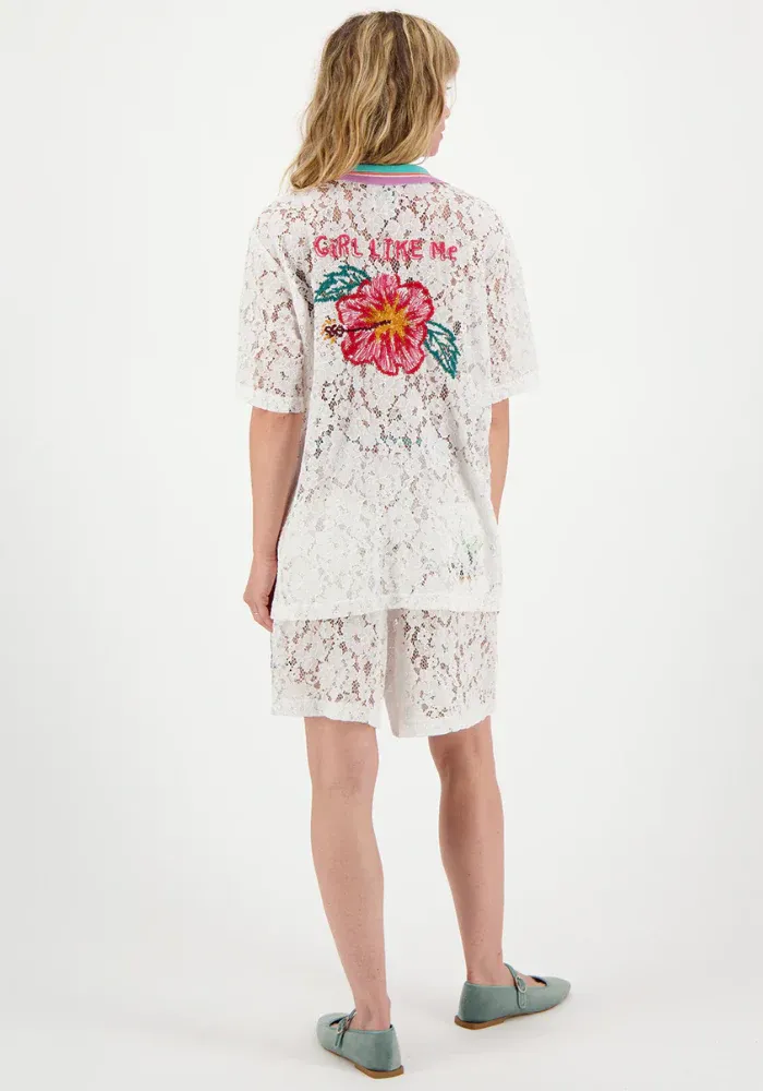 Chemise Megan manche courte en dentelle de couleur blanche avec des broderies florales à l’avant et l’arrière de la chemise avec un col en v.