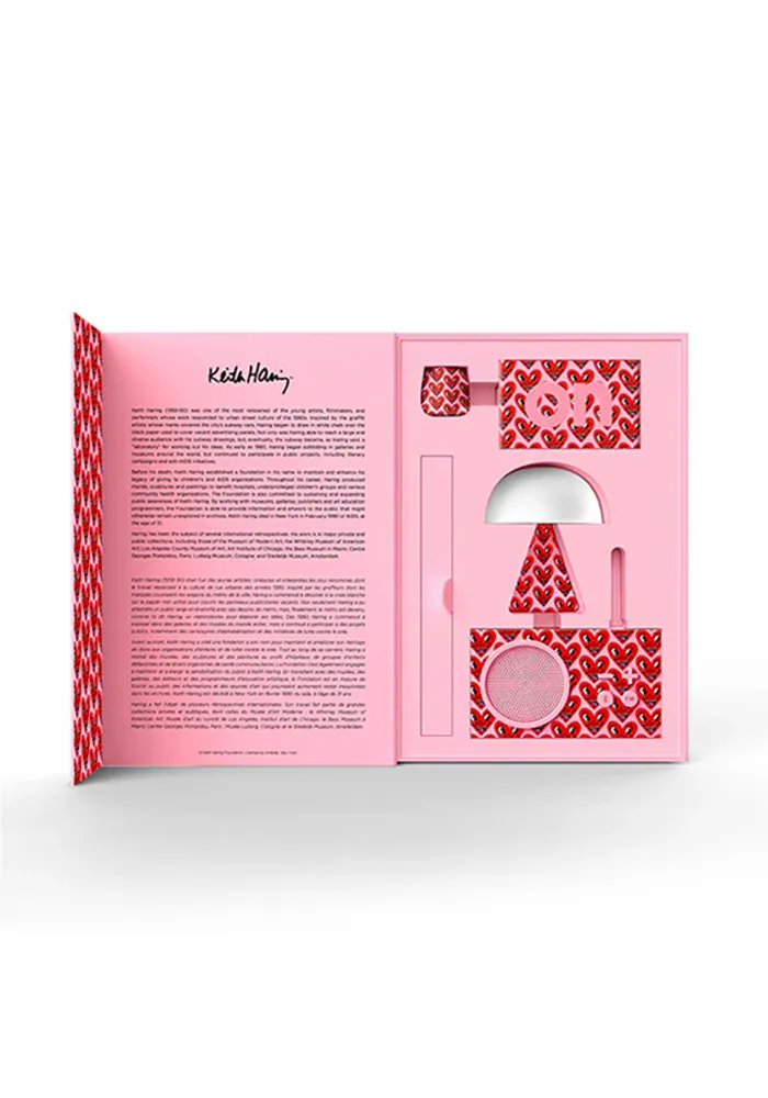 Coffret Cadeau Keith Haring décoré avec des coeurs roses. Il comprend une mini enceinte, un réveil, une radio et une mini lampe.