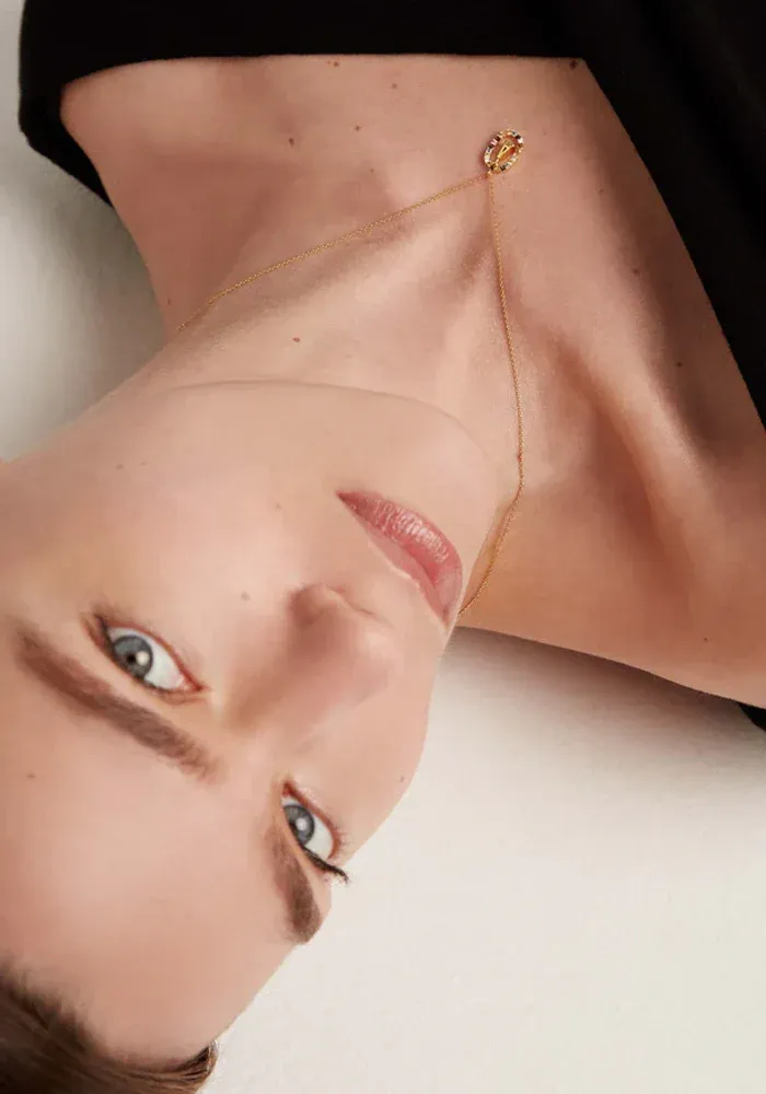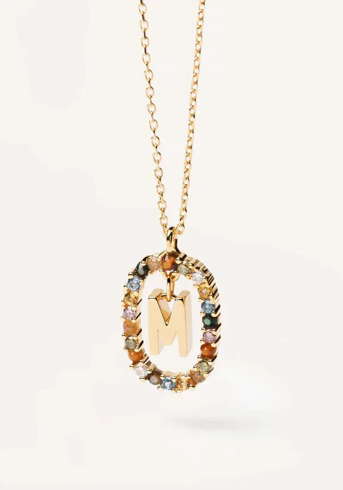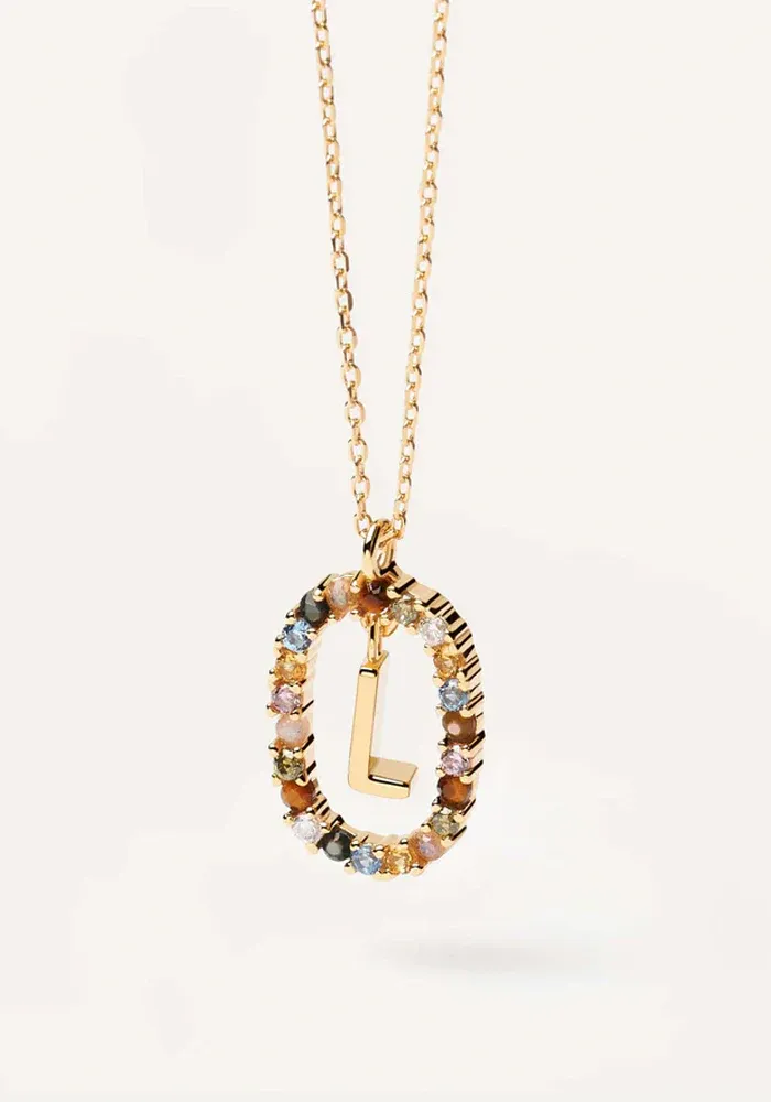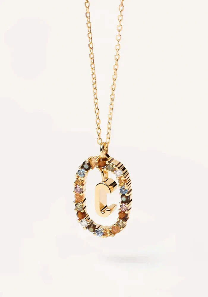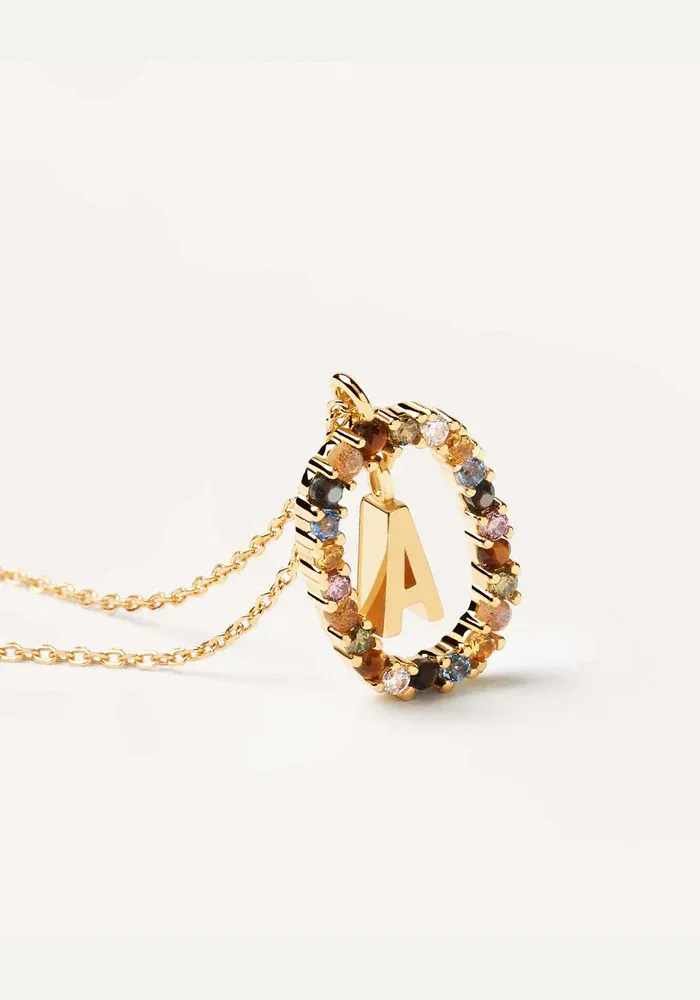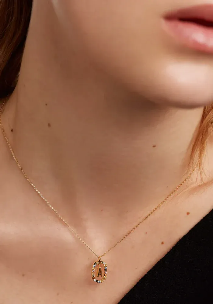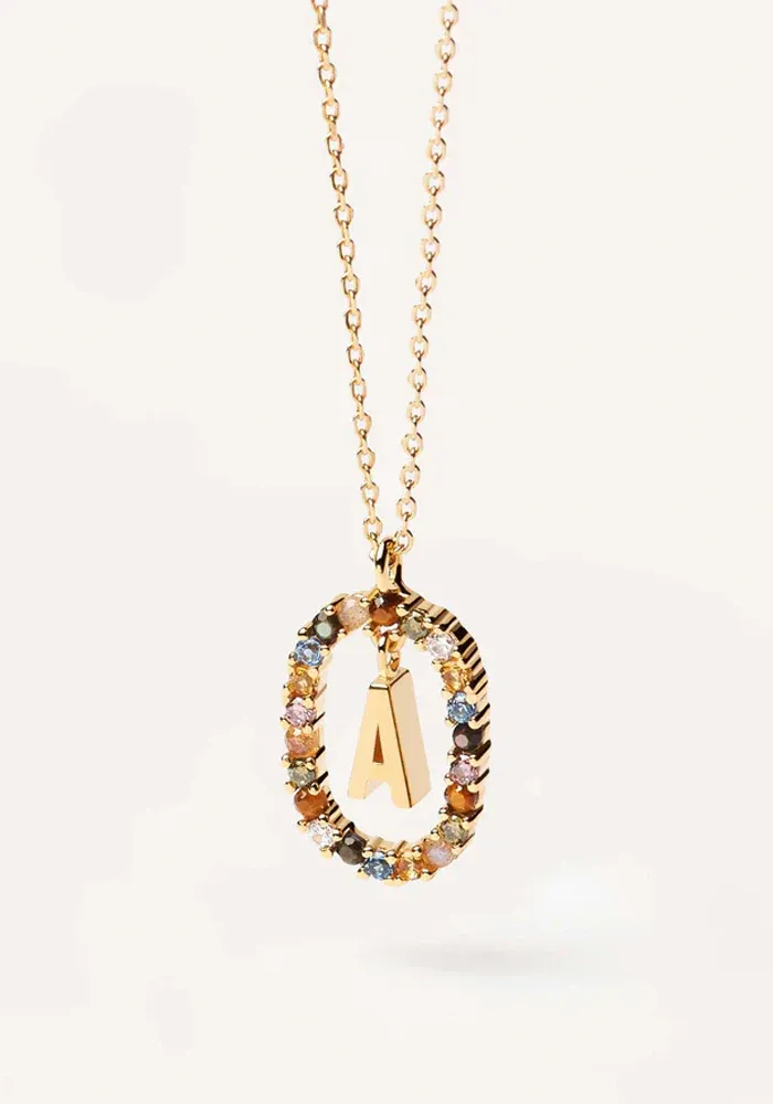Collier Lettre avec une chaine en vermeil et un pendentif lettre entouré d’un ovale décoré de zircons multicolores.