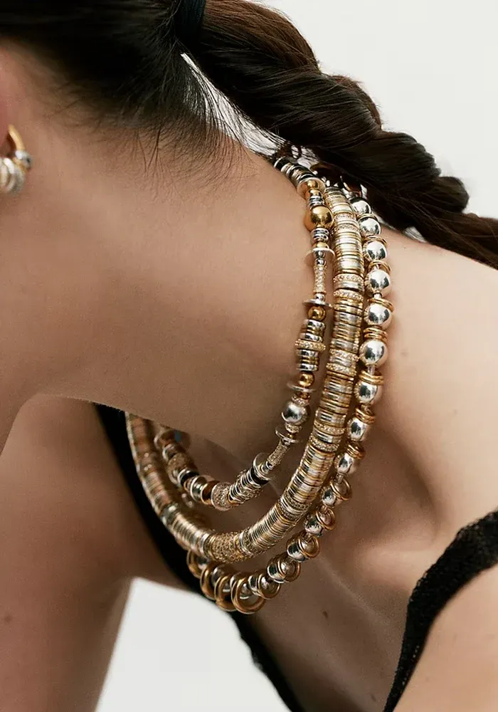 Collier Rondelles qui alterne des perles argentées et dorées.