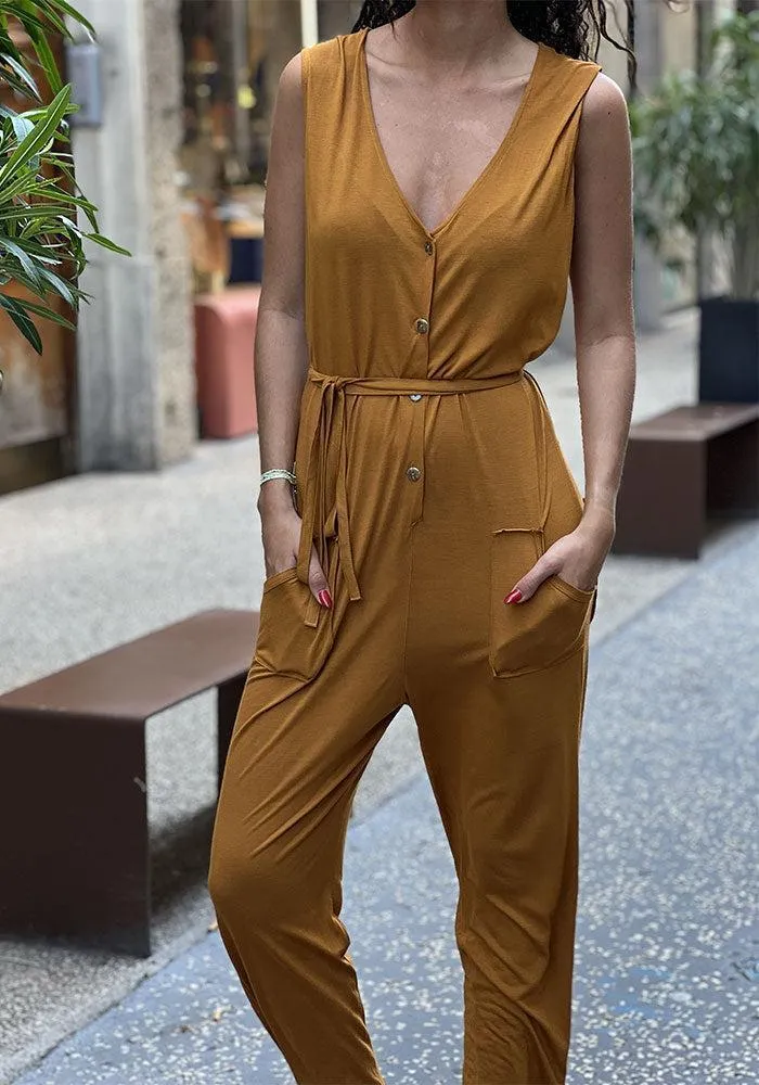 Combinaison pantalon Energie de couleur curry avec une ceinture à la taille. Cette combinaison dispose d’un décolleté en V plongeant, des poches, ainsi que des boutons à l’avant.