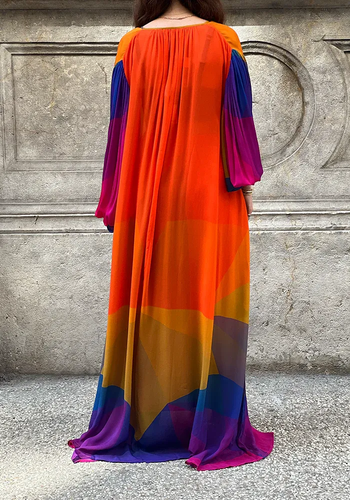 Ensemble Naila 2 Biais Laoun D avec une robe longue à nouer autour du cou avec des manches bouffantes et une jupe droite assortie.