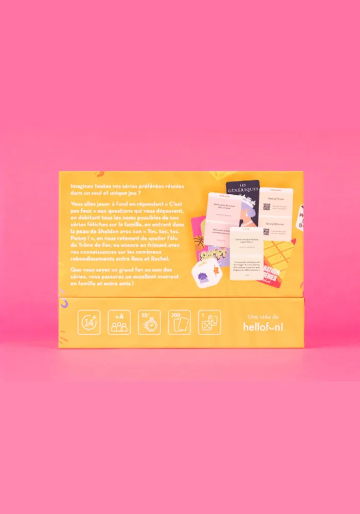Imaginez toutes vos séries préférées réunies dans un seul et unique jeu ? Vous allez jouer à fond en répondant « c’est pas faux » aux questions qui vous dépassent, en débitant tous les noms possibles de nos séries fétiches sur la famille, en entrant dans la peau de Sheldon avec son « Toc, toc, toc, Penny ! », en vous retenant de spoiler l’élu du Trône de Fer, ou encore en frimant avec vos connaissances sur les nombreux rebondissements entre Ross et Rachel. Que vous soyez un grand fan ou non des séries, vous passerez un excellent moment en famille et entre amis !
