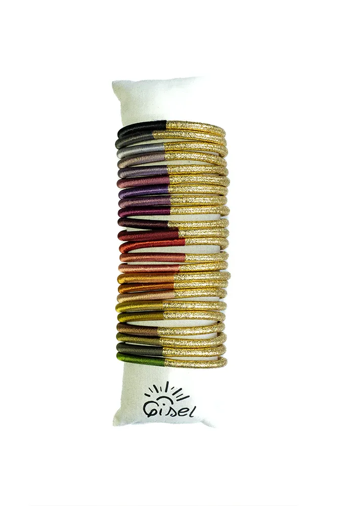 Bracelet Circle avec la moitié recouverte de fils lurex doré et l’autre de fils colorés.