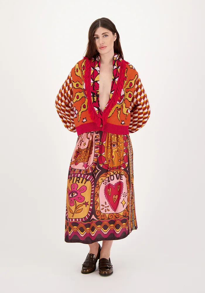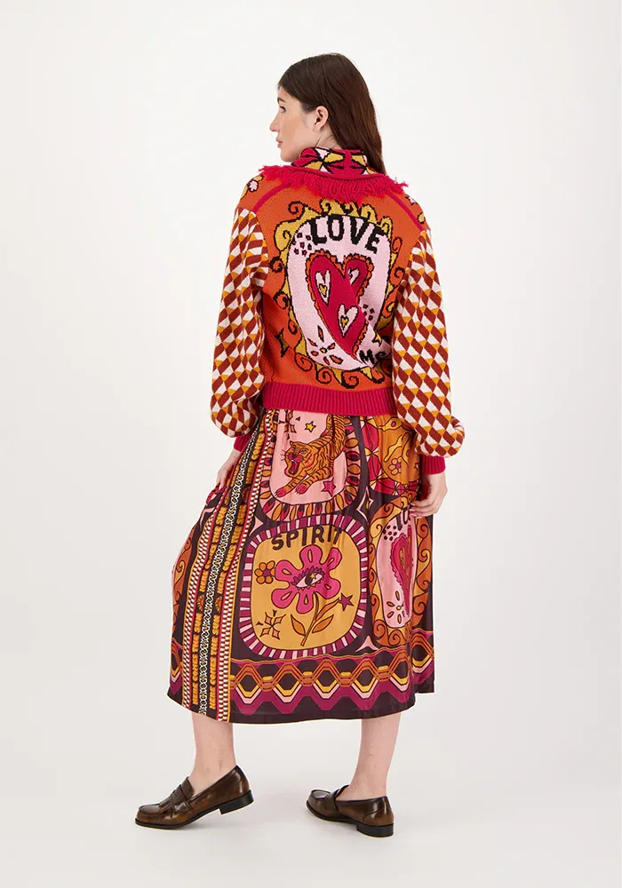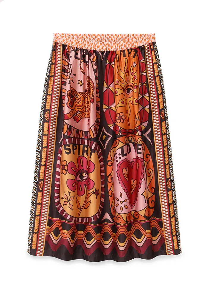 Jupe Vanessa longueur midi avec un élastique à la taille et des motifs.