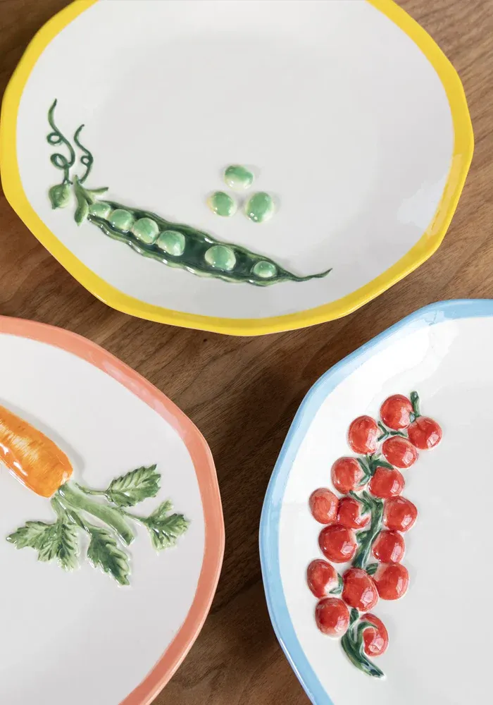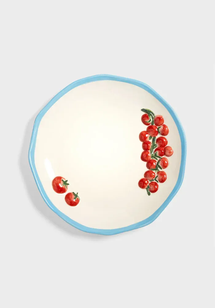 Plat Pomodoro en céramique blanche avec une grappe de tomates rouge en relief et le contour bleu clair.