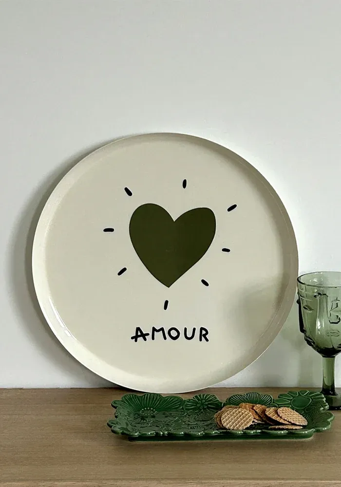 Plateau rond en métal laqué blanc avec un coeur et le le message « amour ».
