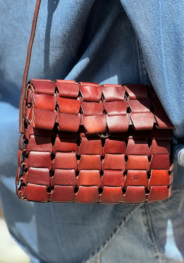 Pochette Link en cuir tressé à la main avec une bandoulière ajustable.