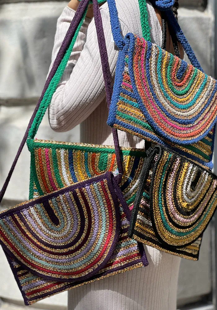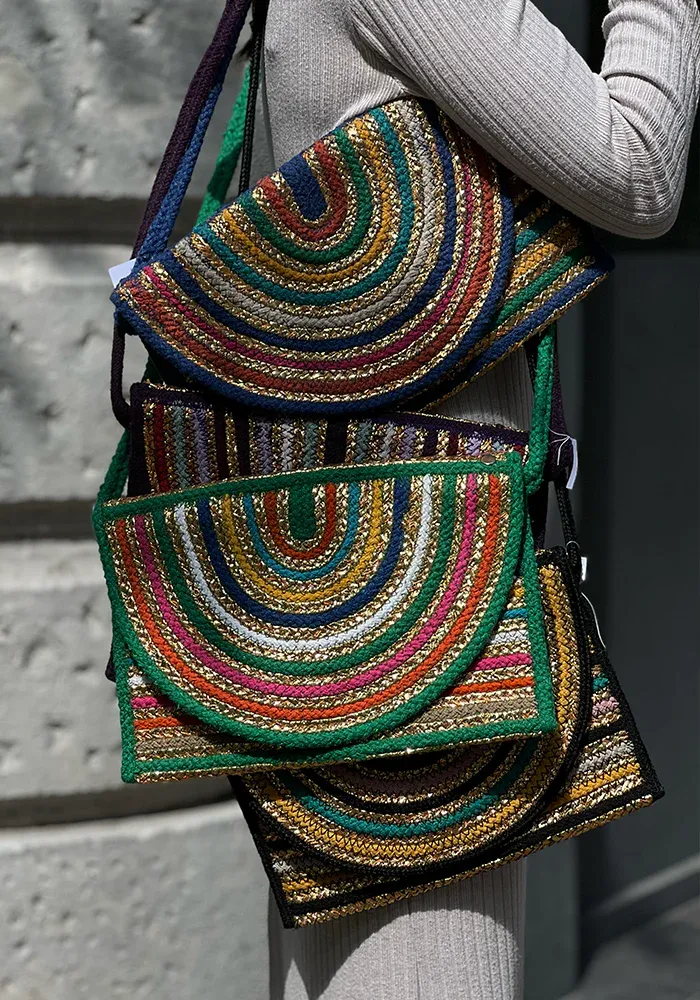 Pochette multicolore et dorée à rabat arrondi, avec anse en coton tissé. Les bordures sont bleues.