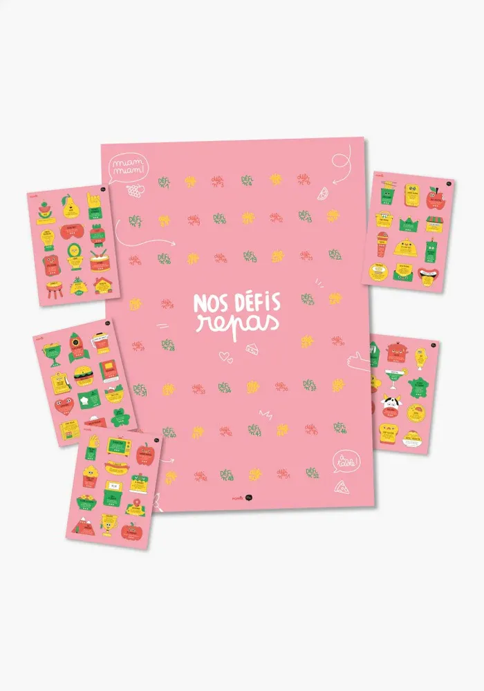 Choisissez ensemble 52 stickers défis parmi tous ceux proposés : un repas tout vert à imaginer ? Un dîner à la bougie ? Un défi pour manger avec les doigts… il y en a pour tous les goûts !