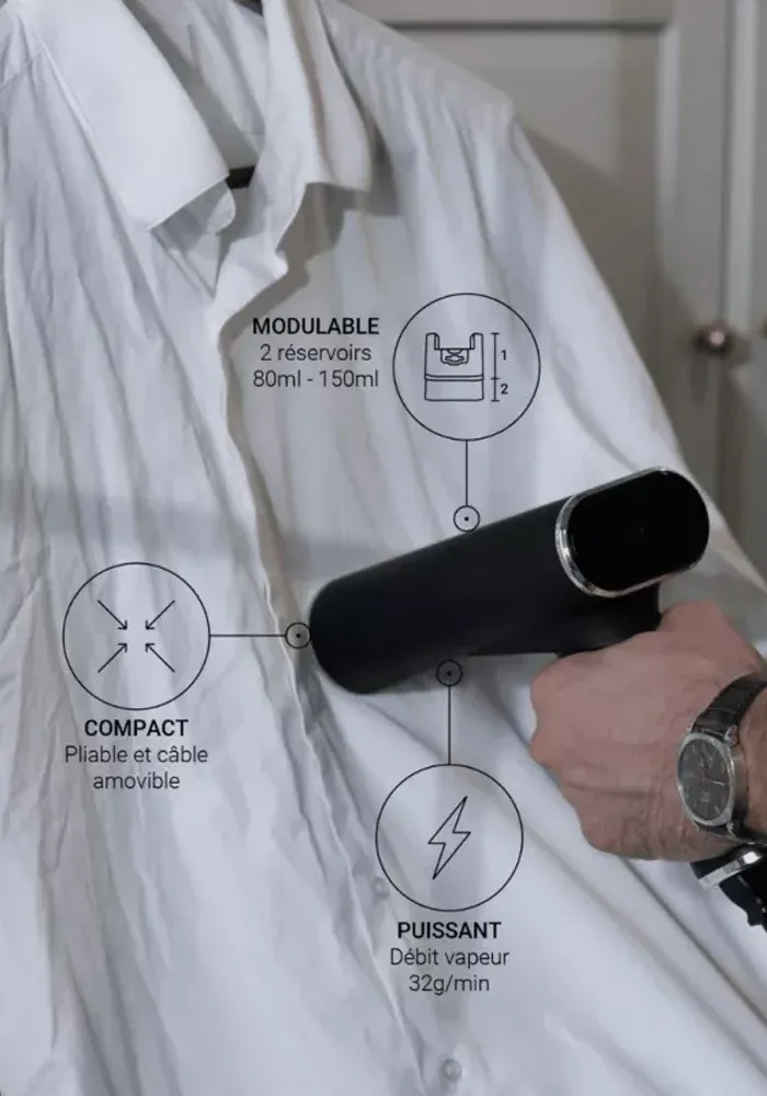 Steamer portatif James Noir a une puissance de 2000 W et un réservoir de 150ml.