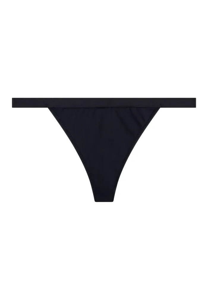 String Roomservice noir avec l’avant opaque et l’arrière décoré de dentelle noire.