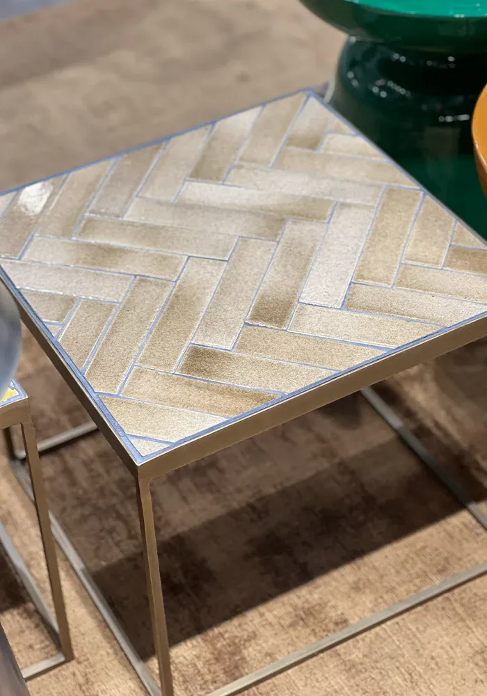Table d’appoint carré avec des pieds en métal dorés avec le plateau recouvert de carrelage en chevron.