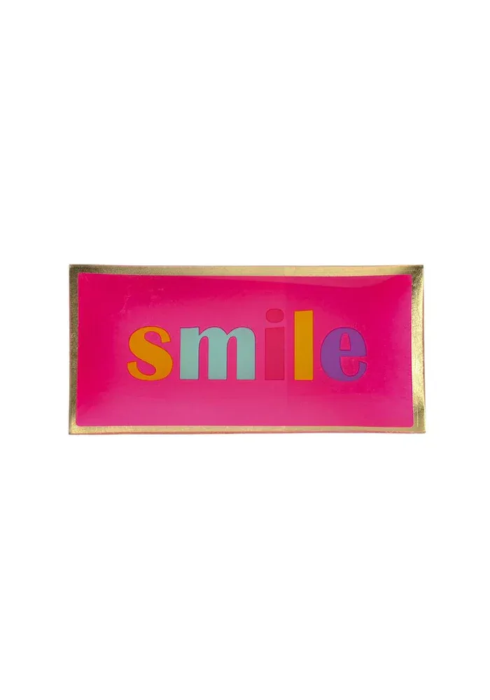 Vide-poche Love L Smile en verre rectangle rose avec le mot « smile » multicolore et les bords dorés.