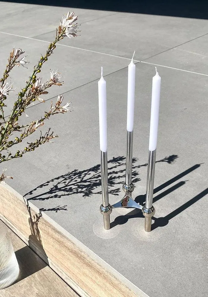 Ensemble de 3 bougies cierges fines teintes à la main en argenté.