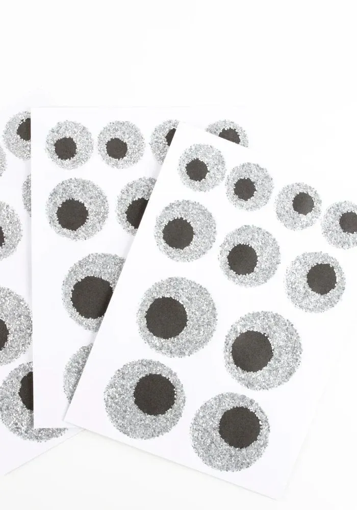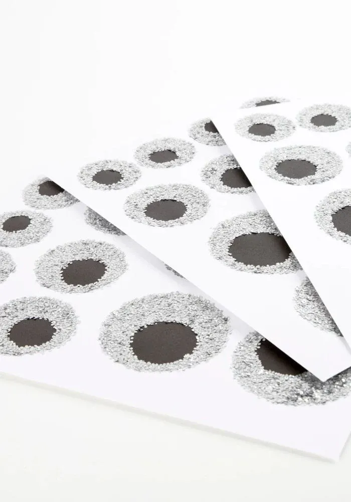 8 feuilles de stickers œil ornés de paillettes argentées et noires, de différentes tailles.
