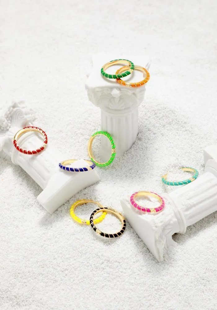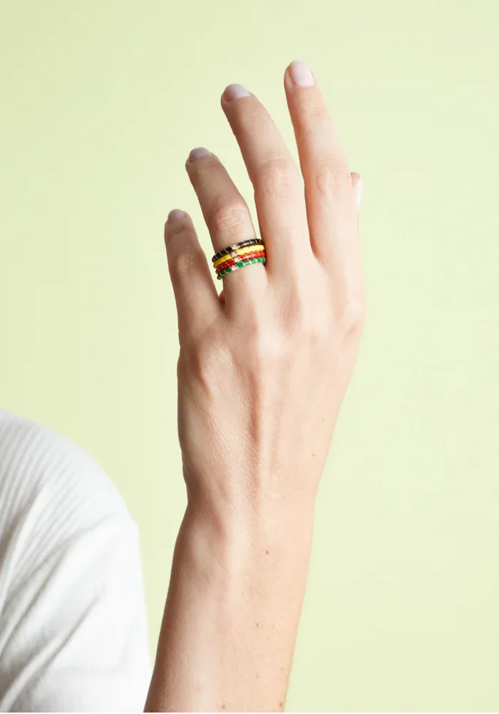Cumuler cette bague avec d’autres bagues fines et la couleur flashy, parfait pour l’été!!