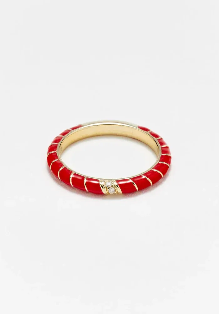 Bague alliance mini torsadée émail rouge et diamants gris montés sur or jaune 9 carats.