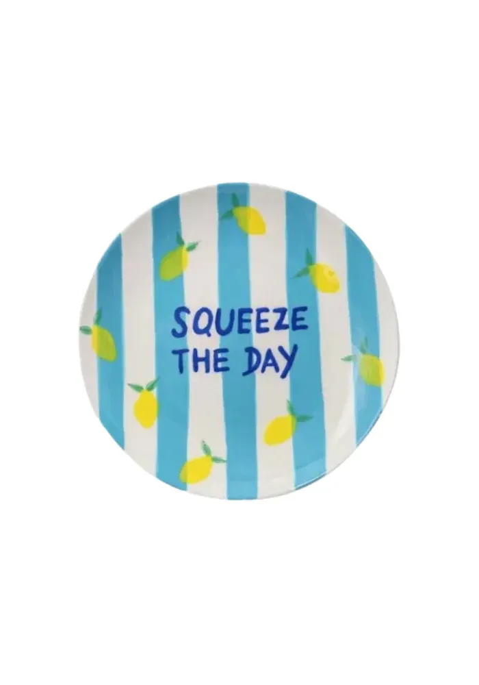 Assiette à dessert Diego Squeeze the day en céramique colorée avec le message « Squeeze the day ».