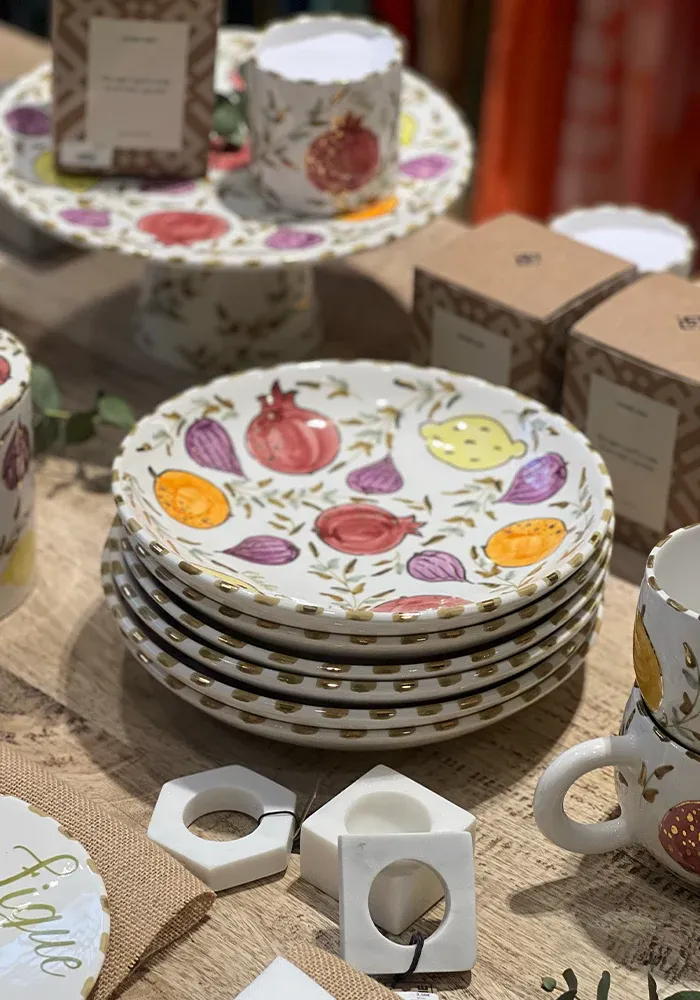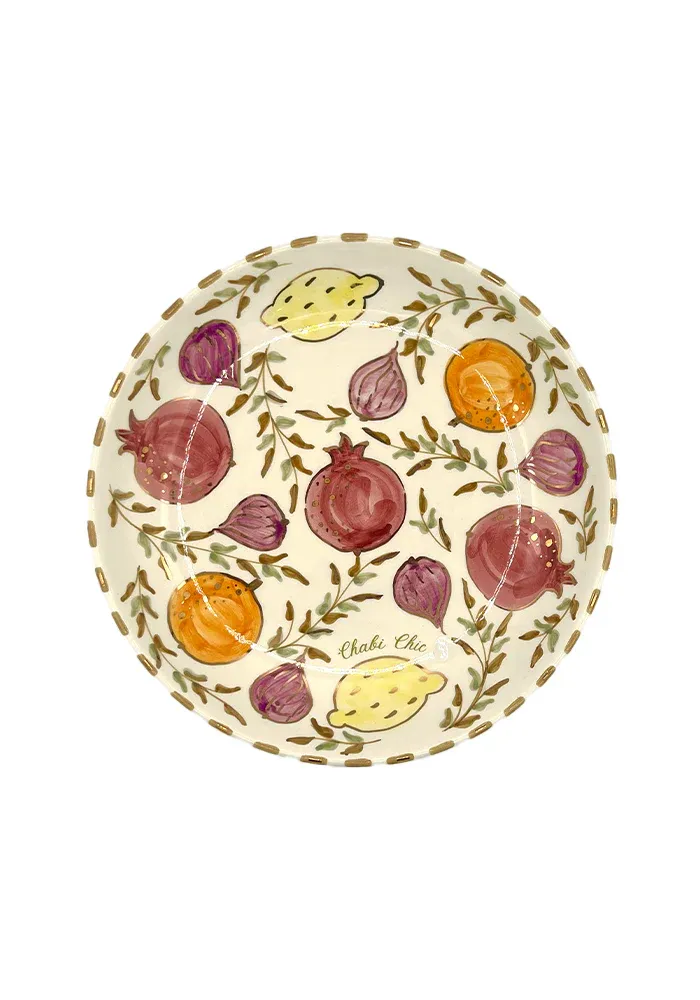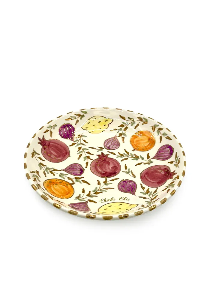 Assiette creuse blanche en céramique décorée de fruits et de dorures.