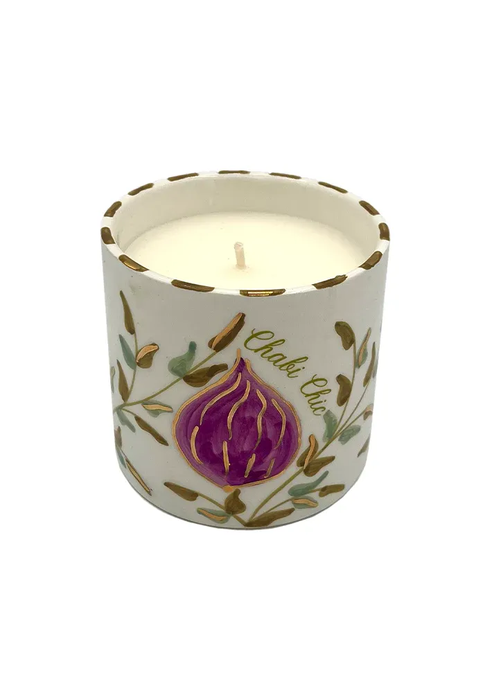 Bougie blanche en céramique décoré de fruits et de dorures.