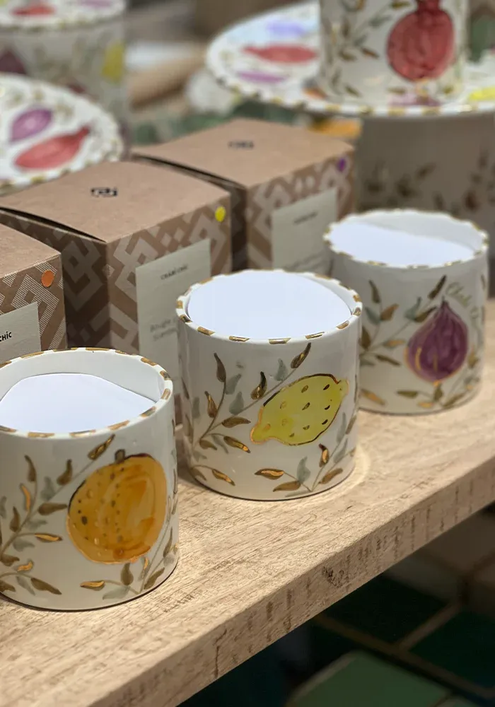 Bougie blanche en céramique décoré de fruits et de dorures.