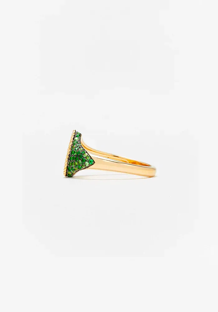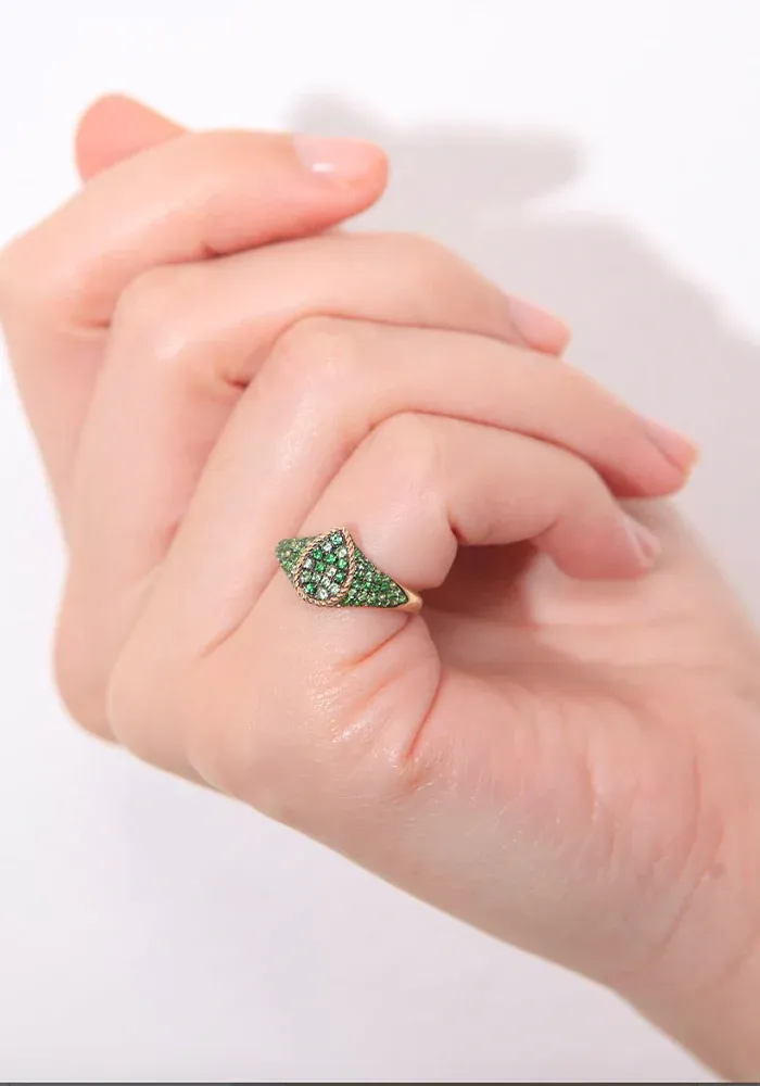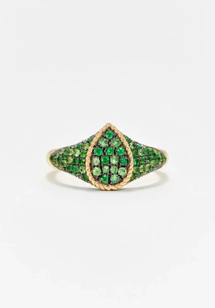 Bague Baby Chevalière Poire or jaune 9 carats pavée de tsavorites.