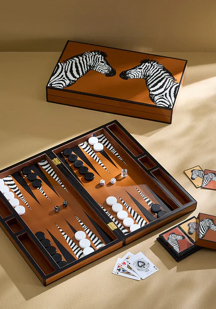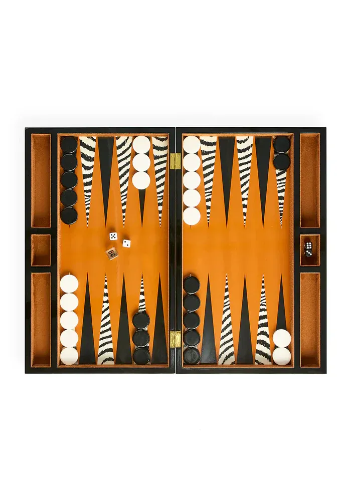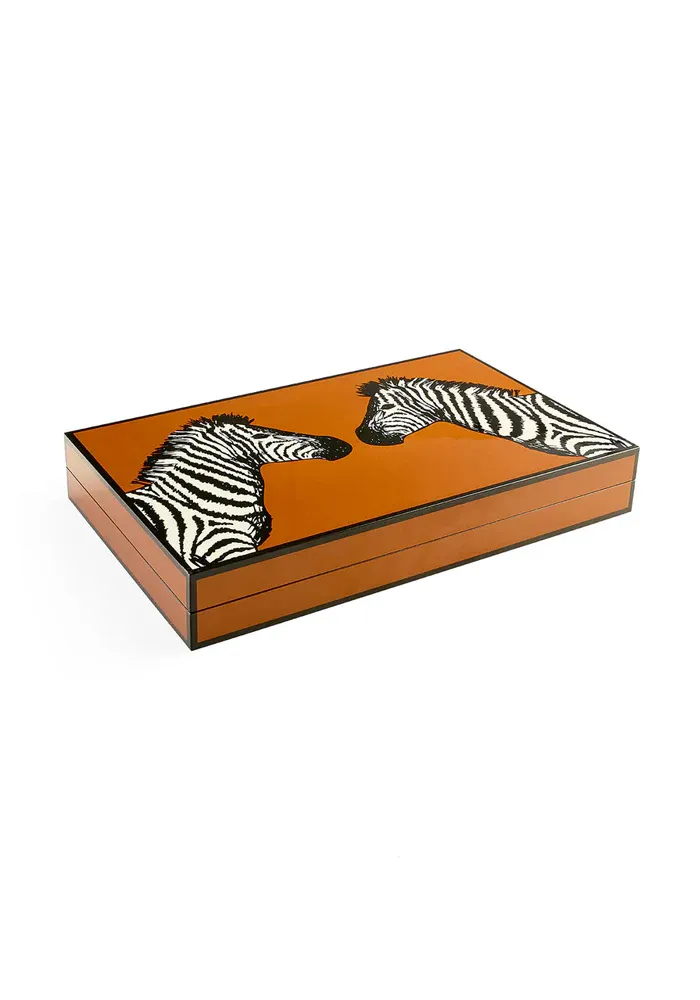 Backgammon Zebra orange avec deux zèbres sur le dessus de la boite.