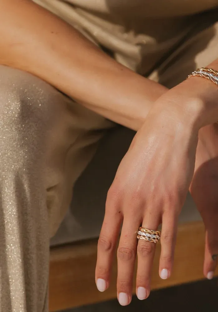Bague ajustable avec un effet tressé dont l’un des brins est lisse et l’autre est en corde de basse.