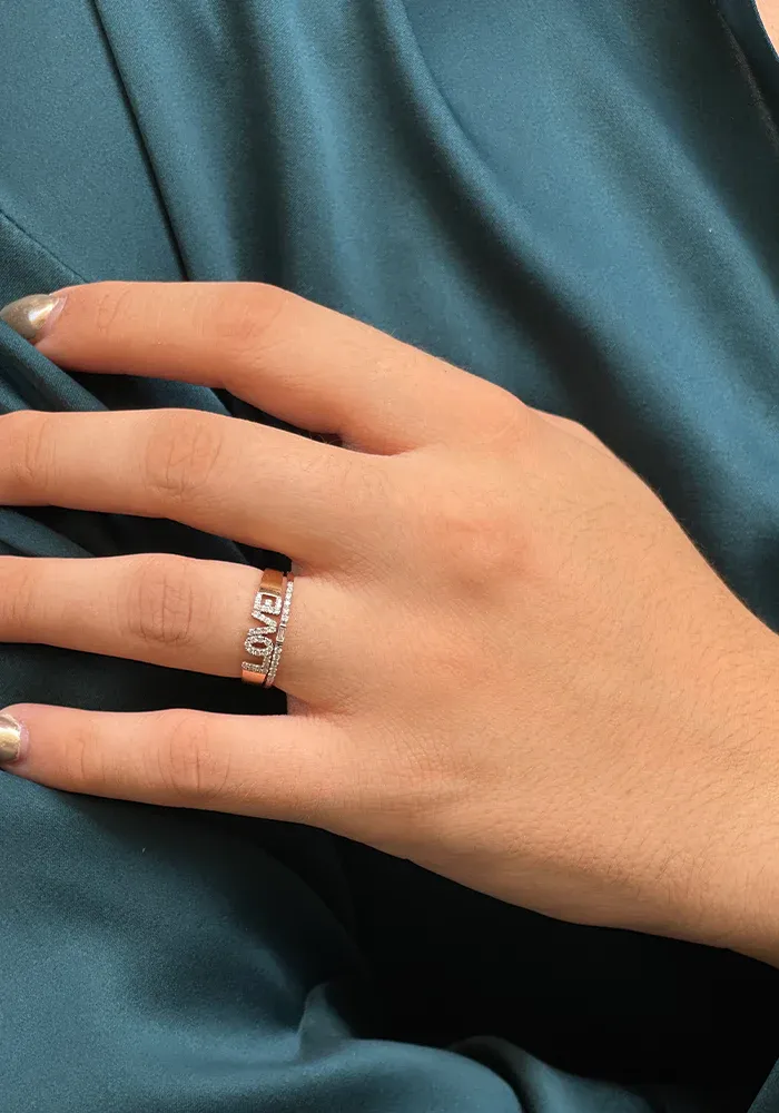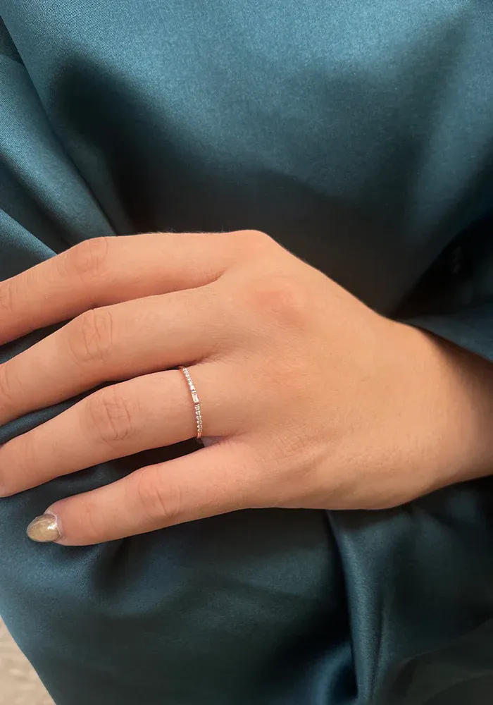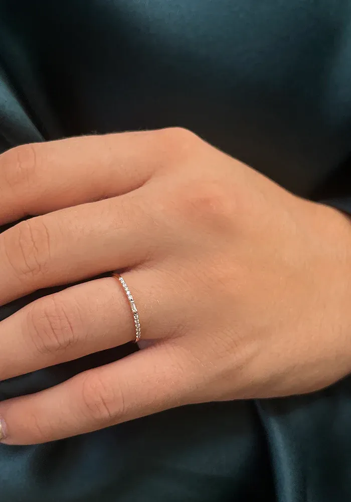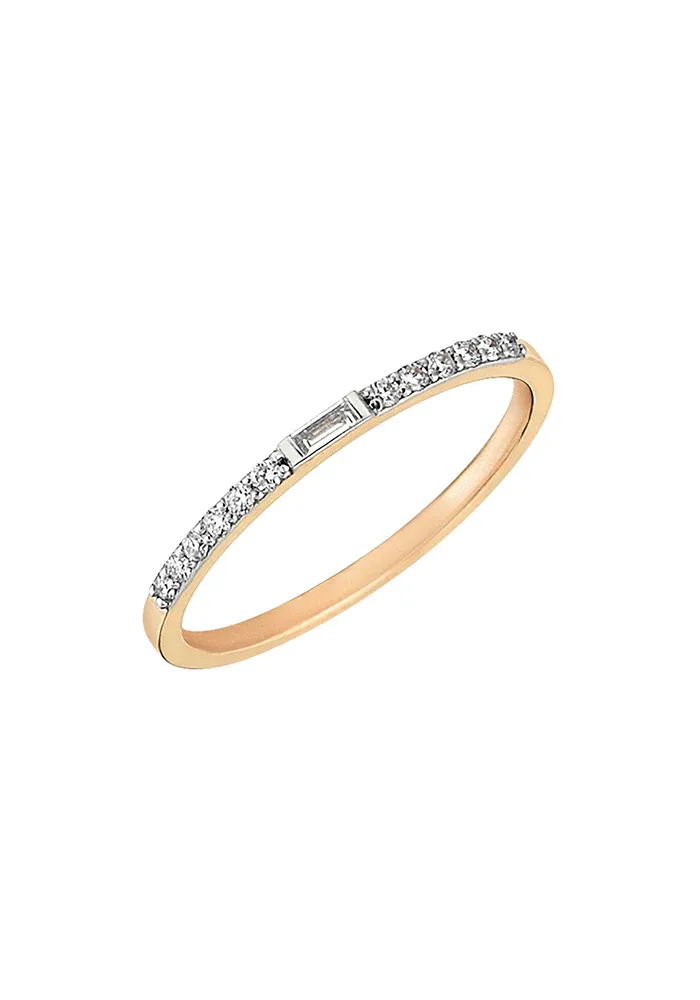 Bague fine en or rose 14 carats, pavée sur la moitié de diamants blancs avec un diamant baguette au centre.